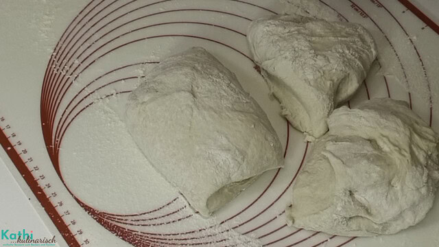 - Jetzt den Teig in 3 gleich schwere Stücke zu je ca. 330 g teilen.